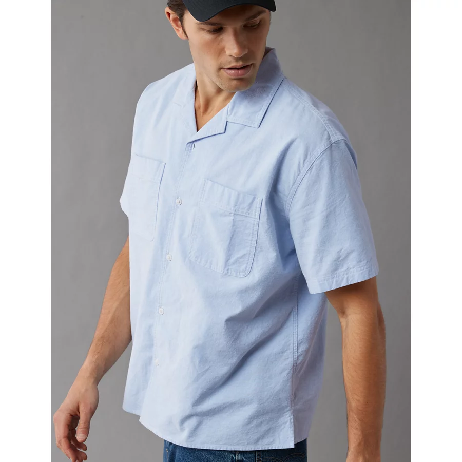 Crisp oxford cotton with a hint of stretchCamp collarFull button-up frontSingle chest pocketThis shirt is Real Good: Made with the