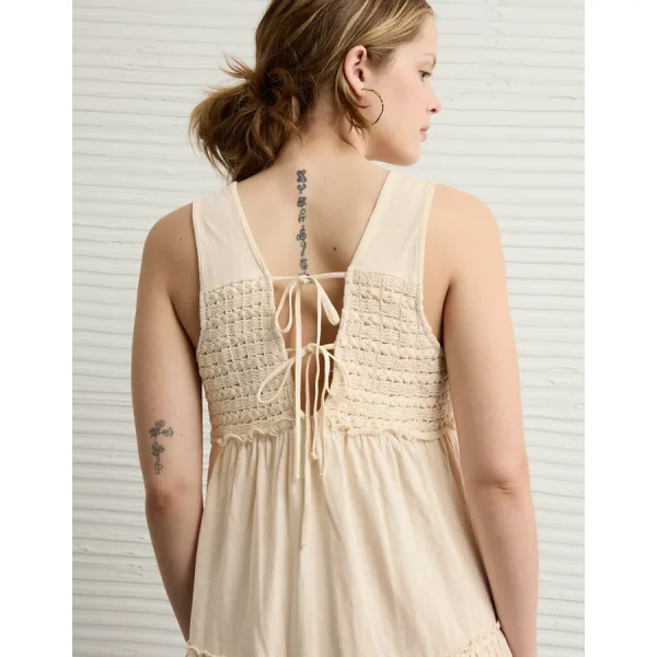 Crochet-inspired bustTie detail at backV-neckTiered skirt 100% CottonMachine washImported Babydoll silhouetteMini lengthSleeveless