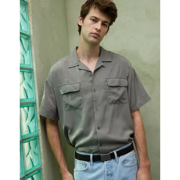 AE77 Premium Relaxed Short-Sleeve Button-Up Shirt – Olive