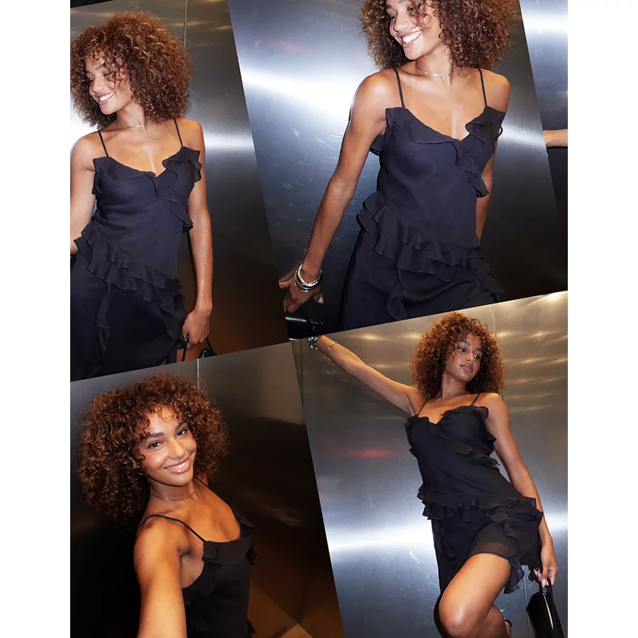 Chiffon fabricV-neckAsymmetrical ruffle details throughout 100% PolyesterMachine washImported Slip dress silhouetteMaxi lengthSleeveless