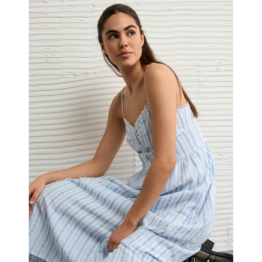 AE Asymmetrical Ruffle Maxi Slip Dress – Light Blue