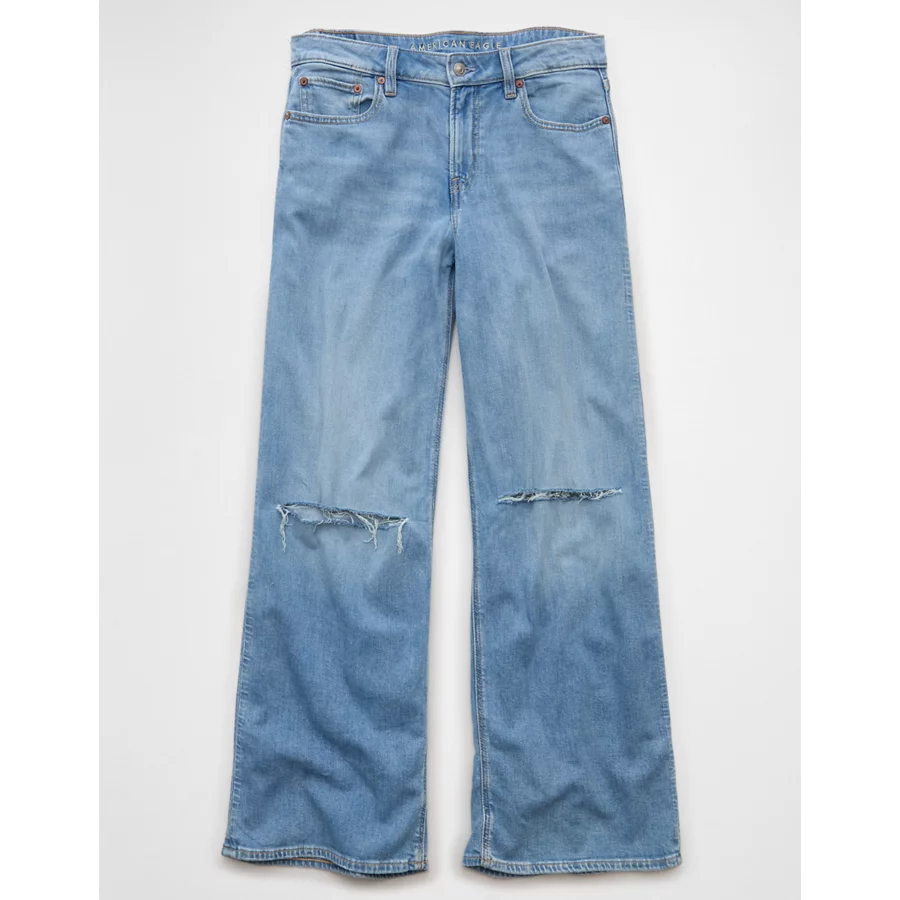 AE Dreamy Drape Stretch Ripped Low-Rise Baggy Wide-Leg Jean – Indigo Skylight Destroy