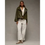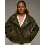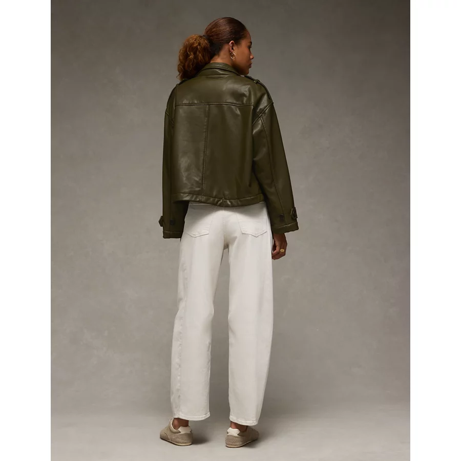 AE Faux Leather Cropped Bomber Jacket - Olive