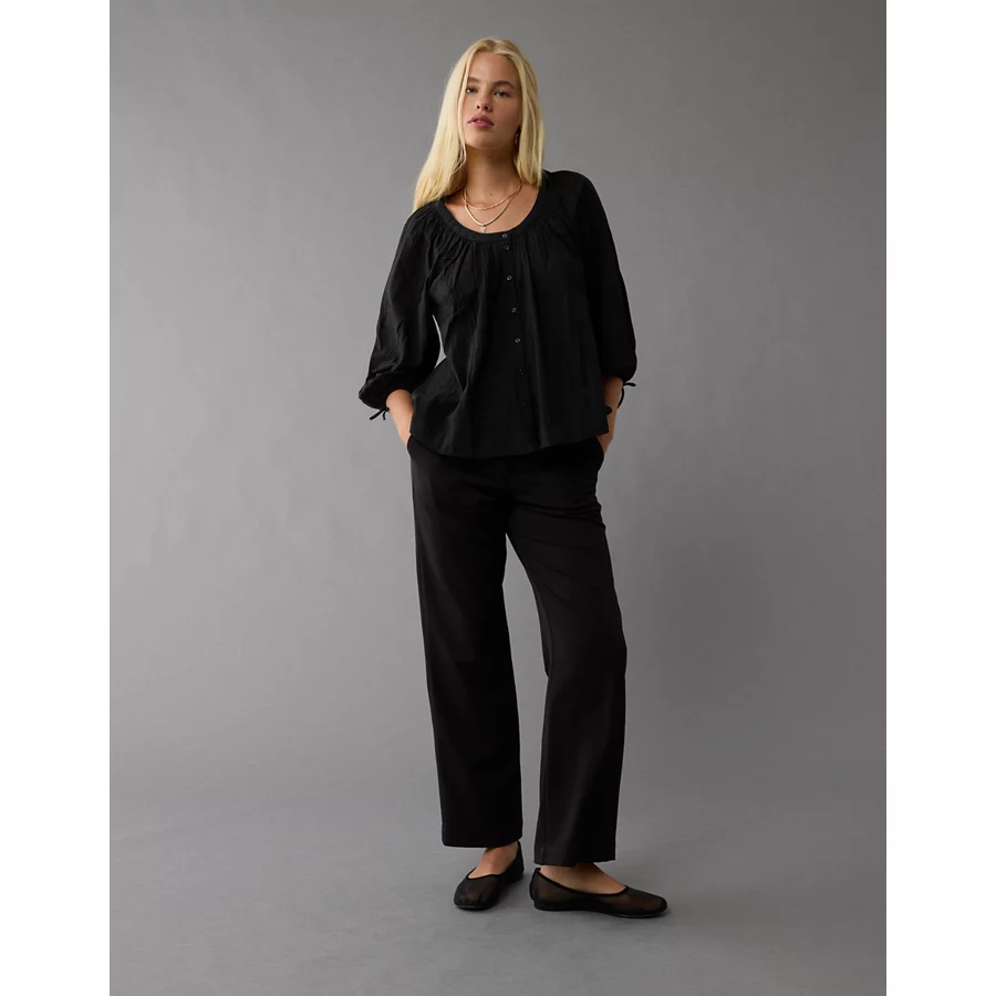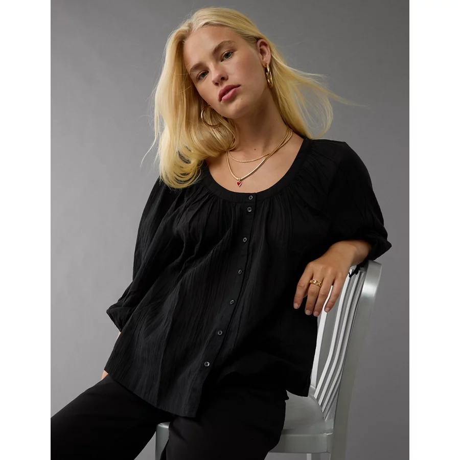 AE Long-Sleeve Open Neck Blouse – Black