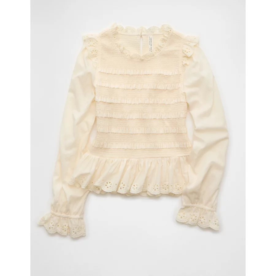 AE Long Sleeve Smocked Babydoll Blouse – Cream
