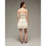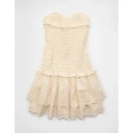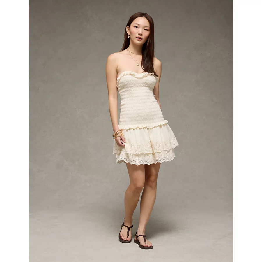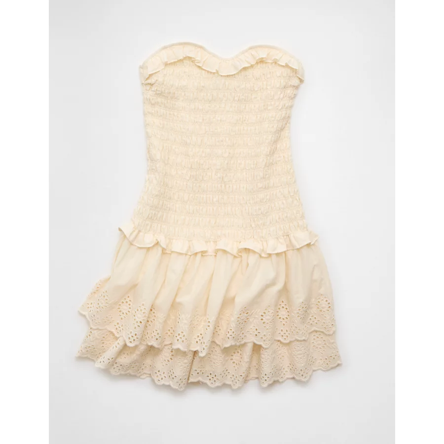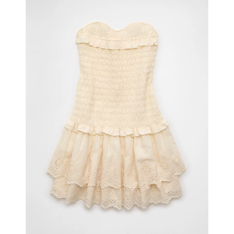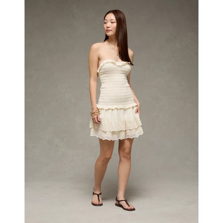 AE Strapless Smocked Ruffle Drop Waist Mini Dress – Cream
