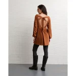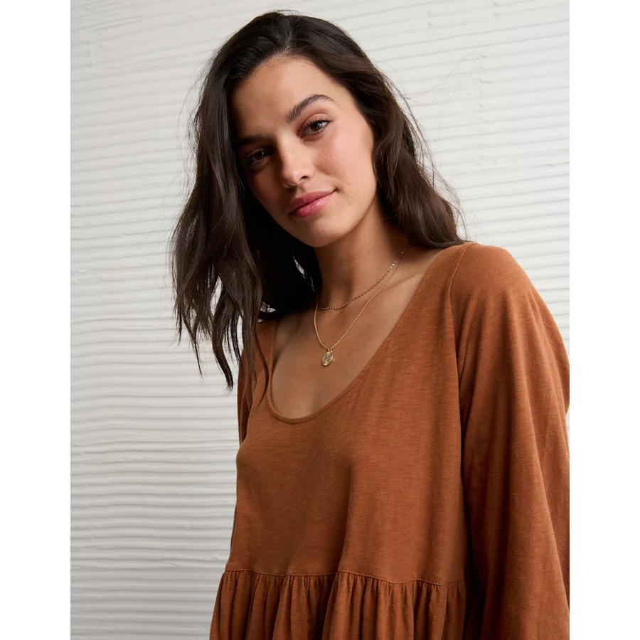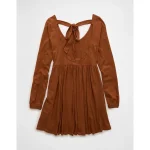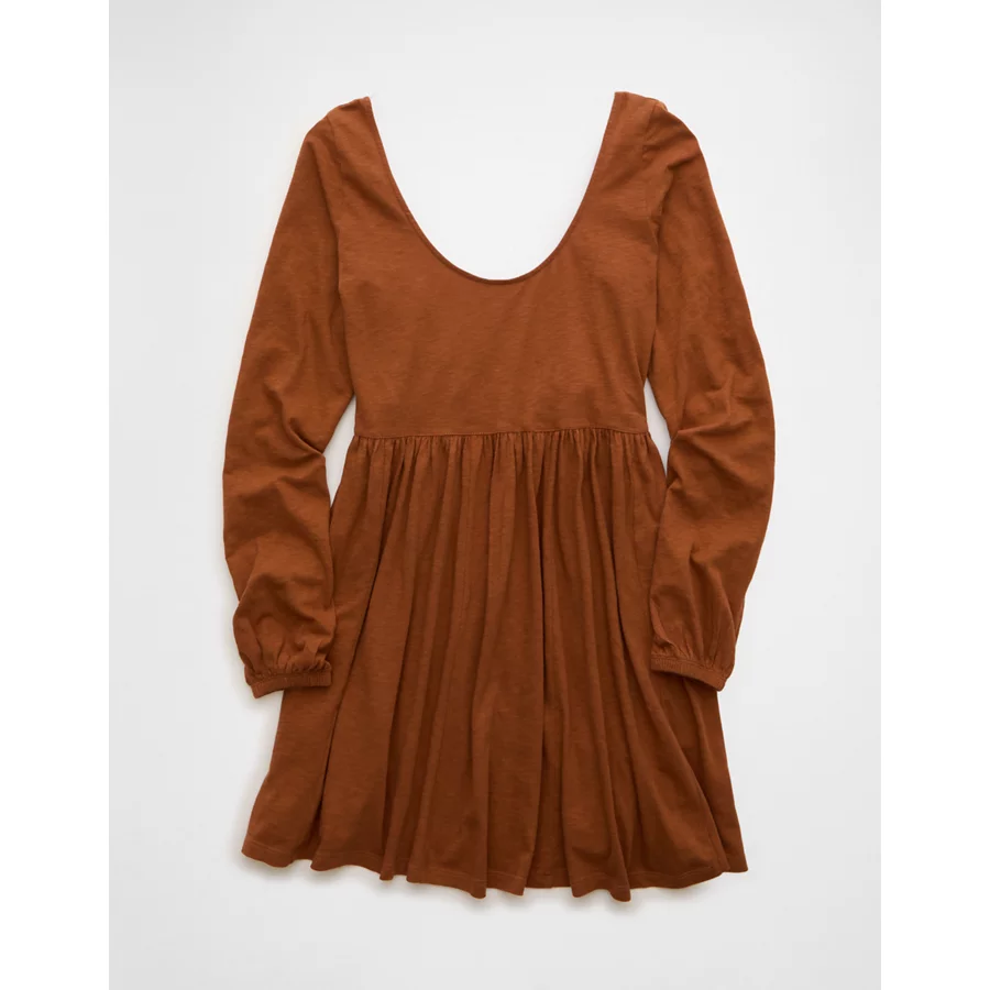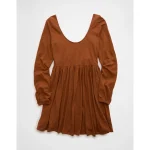 AE Sunchaser Knit Long-Sleeve Scoop Neck Mini Dress – Amber Brown