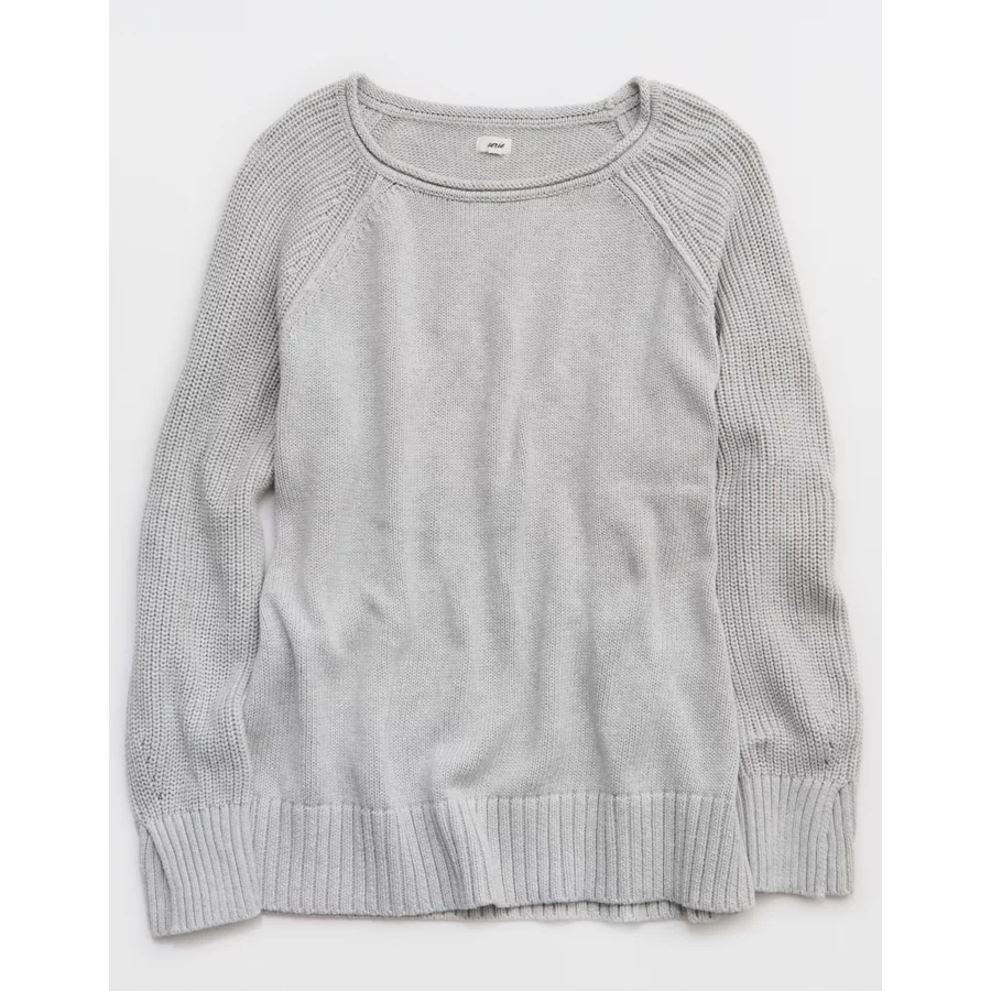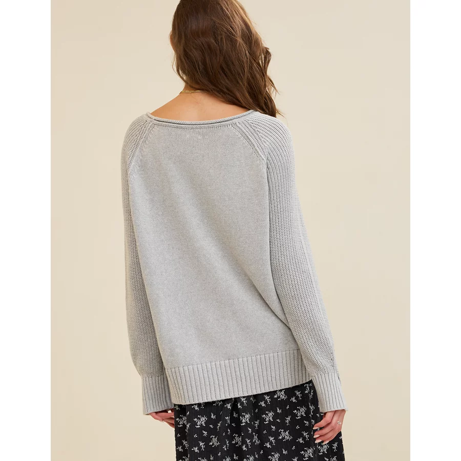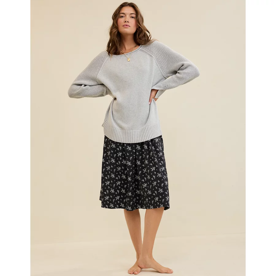 Real Good Everyday yarnRolled necklineRibbed trim on cuffs and hemPointelle deets and split cuffs on the sleevesStripedAccessibility deets: over-the-head access