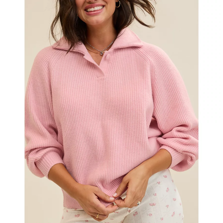 Real Good Everyday yarnRolled necklineRibbed trim on cuffs and hemPointelle deets and split cuffs on the sleevesStripedAccessibility deets: over-the-head access