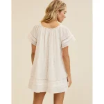 Mixed fabrics! Soft, stretchy knit bodice with a lightweight gauzey skirtScoop necklineSide seam pockets (!!)Accessibility deets: over-the-head access for easy