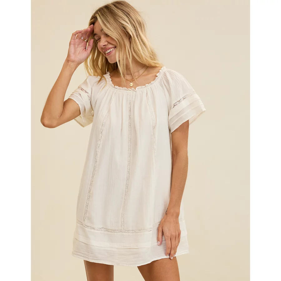 Lightweight gauze fabric with interior lining on top half Smocked waistCenter front slitFunctional buttons on the frontFemme ruffle and crochet