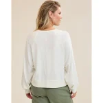 Real Good Everyday yarnRolled necklineRibbed trim on cuffs and hemPointelle deets and split cuffs on the sleevesThis style is heathered