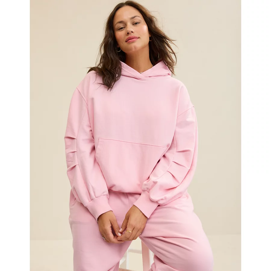 Real Good Everyday yarnRolled necklineRibbed trim on cuffs and hemPointelle deets and split cuffs on the sleevesThis style is heathered