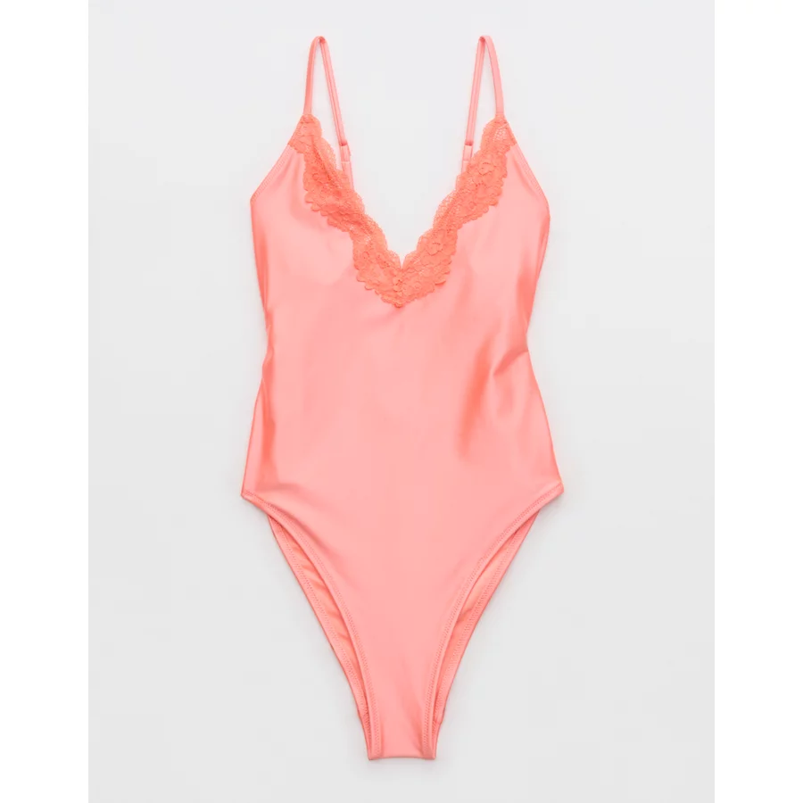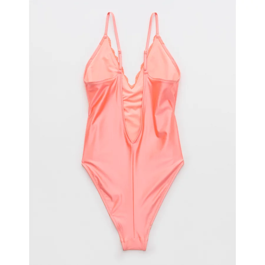 Aerie Shine Lace Plunge One Piece Swimsuit – Coral Crush