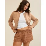 Ribbed trim on the neck, cuffs, hem, and placket