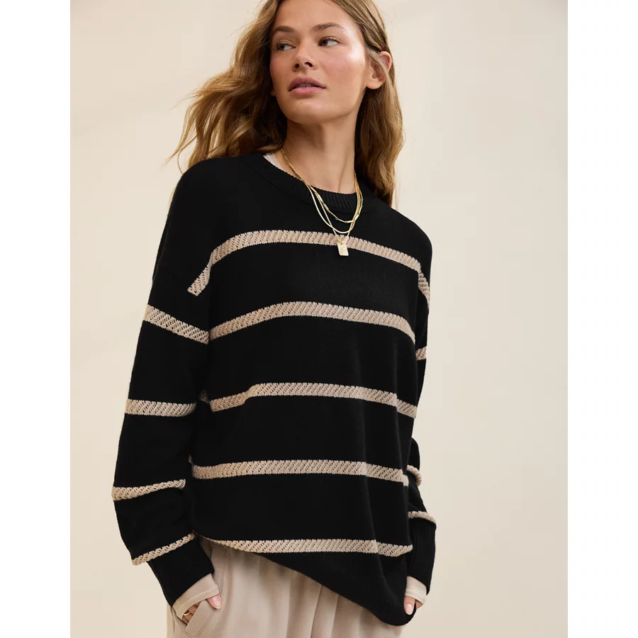 Real Good Everyday yarnRolled necklineRibbed trim on cuffs and hemPointelle deets and split cuffs on the sleevesStripedAccessibility deets: over-the-head access
