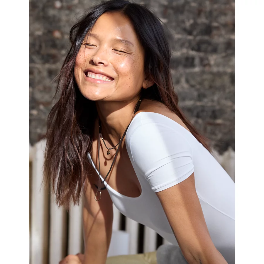 Ultra-soft Real Good Buzzed Terry fabricNEW! UPF 50 sun protectionStrappy back deets! 85% Recycled Nylon, 15% ElastaneUse a mild detergent