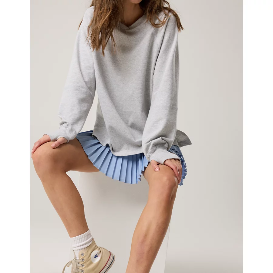 Real Good Everyday yarnRolled necklineRibbed trim on cuffs and hemPointelle deets and split cuffs on the sleevesThis style is heathered