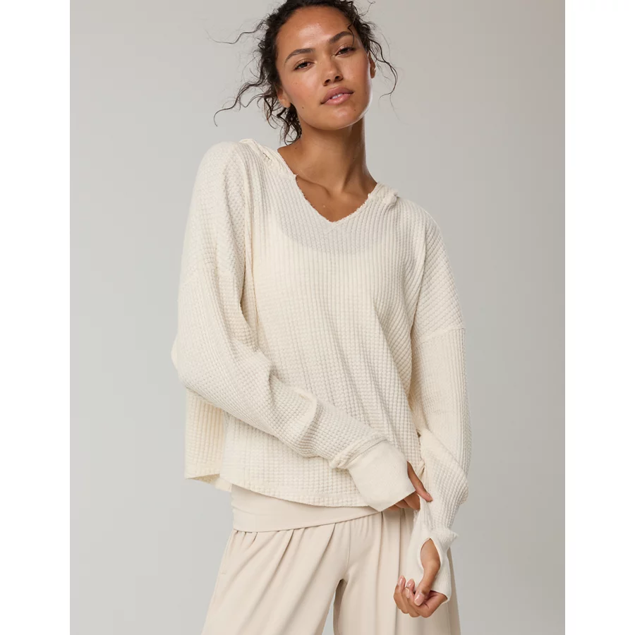 THE LOOK: Ultra-textured waffle knit. Cutaway notch at neck with hood at back. Thumbholes.