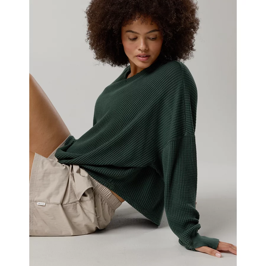 THE LOOK: Ultra-textured waffle knit. Notch neckline. Thumbholes.