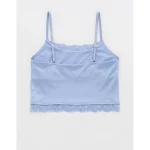 Design: Lace trim along neckline and bottom hem. Crop length hits at waist.